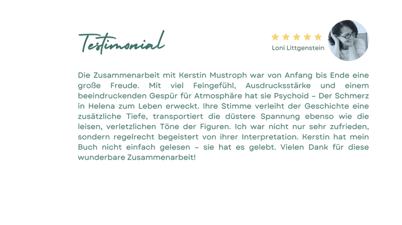 Egal, ob du meine angenehme und wandelbare Stimme für ein Hörbuch, Voice Over deiner Werbung, Erklärvideo, Dokumentation oder Telefonansage auswählst, ich setze dein Projekt schnell und zuverlässig um.